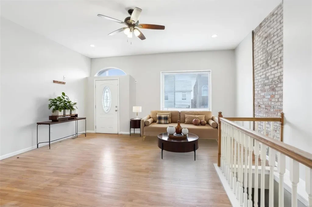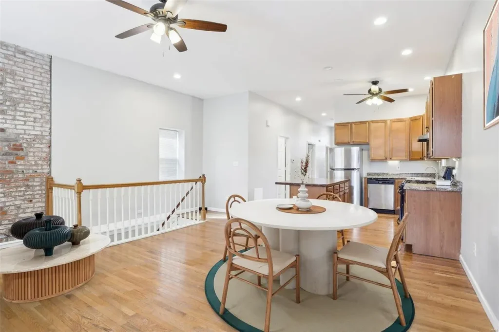 Historic charm with modern updates, featuring brick exterior, exposed brick in the living room, soaring ceilings, and an updated kitchen